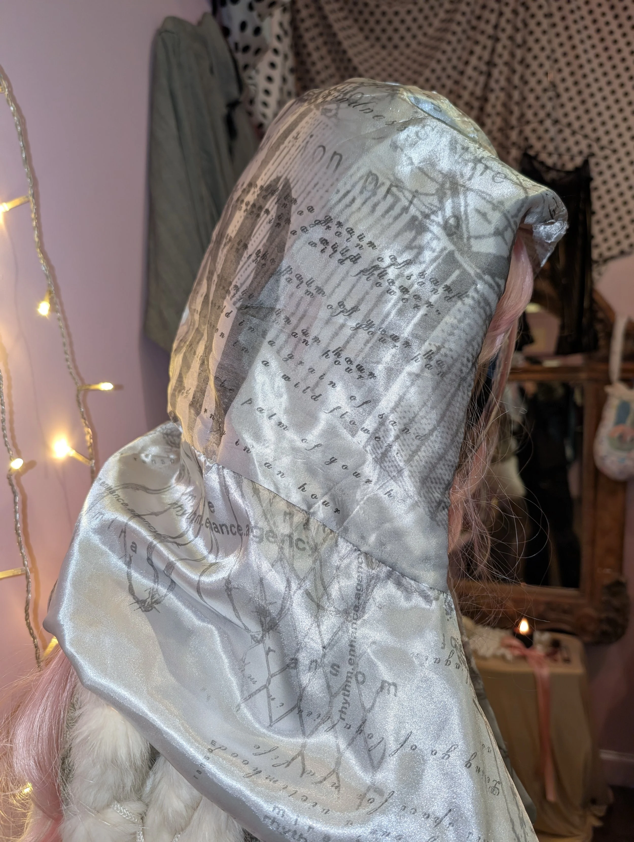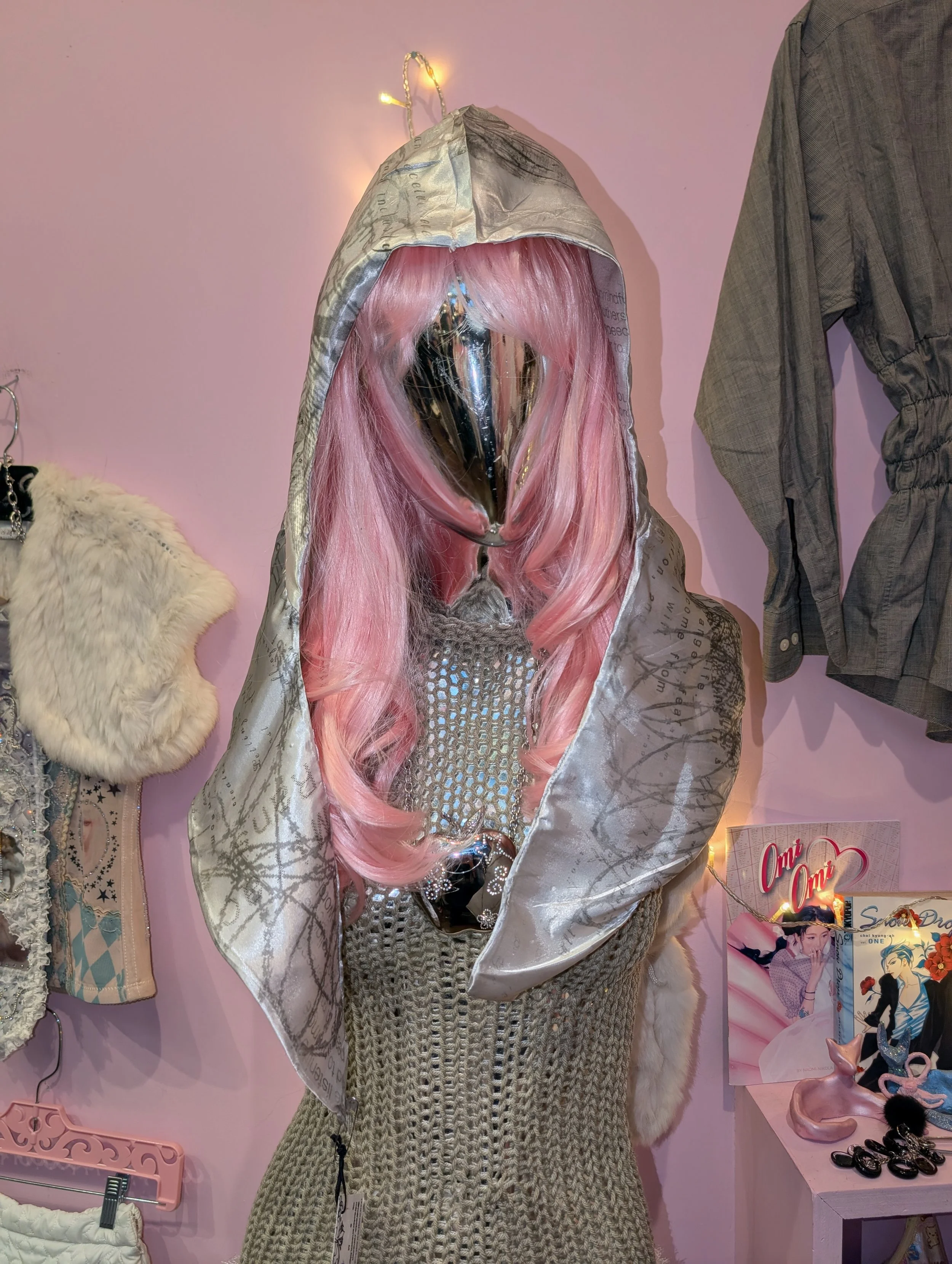 miracle ransom › miracle ransom Chained hood Image 1 of 4 Image 2 of 4 Image 3 of 4 Image 4 of 4 miracle ransom Chained hood $145.00 gray reversible satin hood, printed with wintergreen oil/xerox scans Add To Cart Added! gray reversible satin hood, printed with wintergreen oil/xerox scans